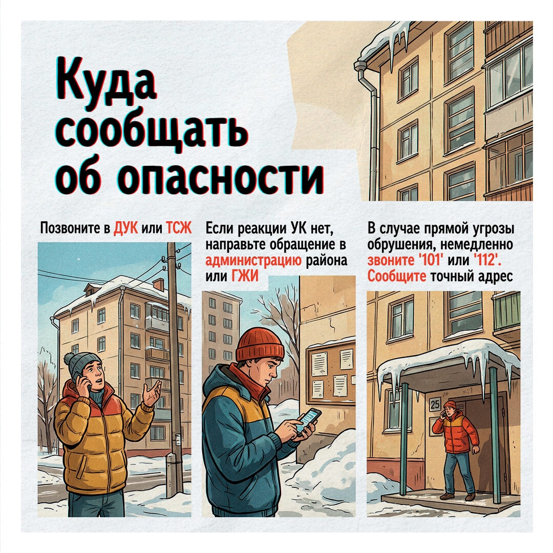 В карточках — кто отвечает за уборку снега и льда с крыш, куда обратиться, если ДУК бездействует и по какому номеру телефона можно сообщить об угрозе обрушения снежных масс.