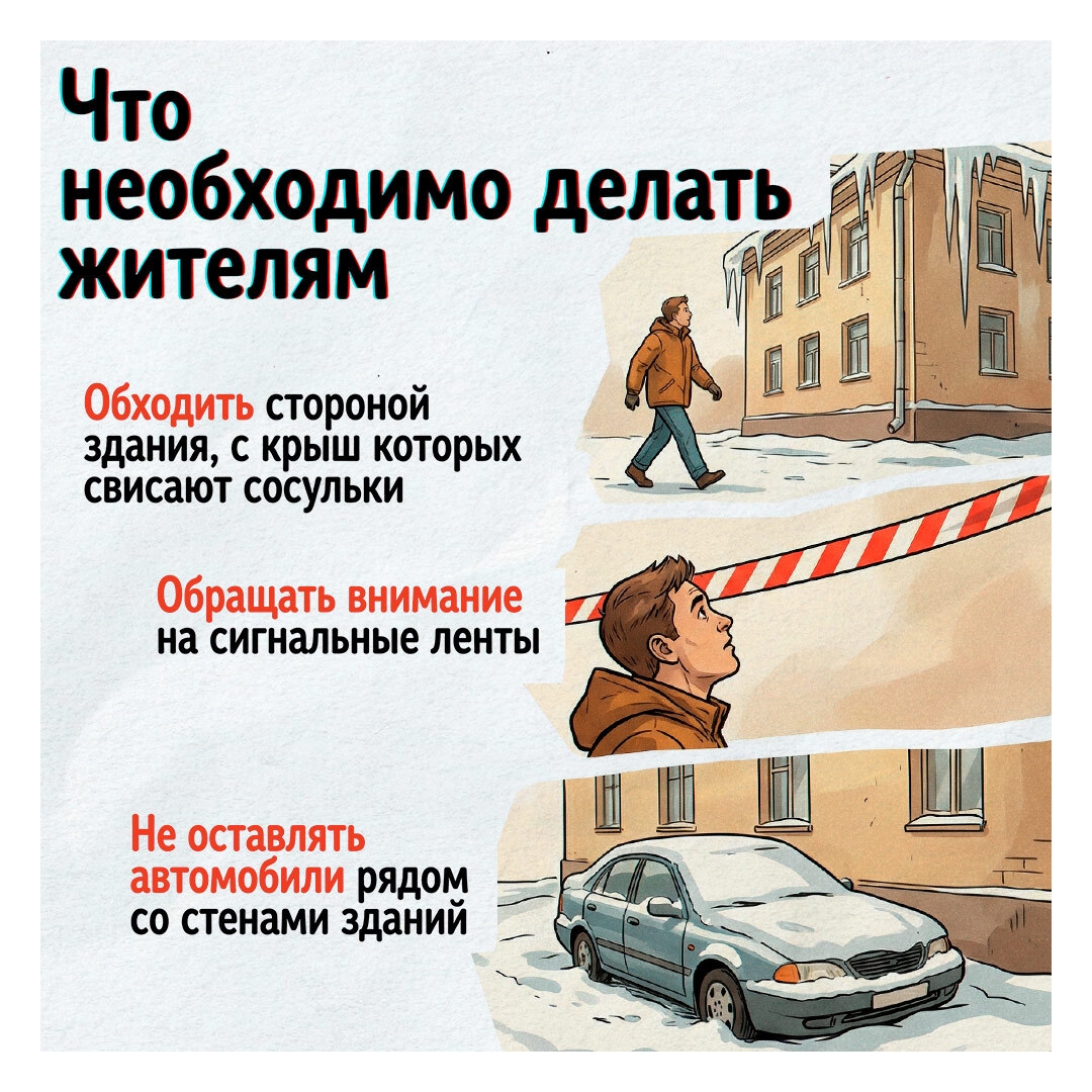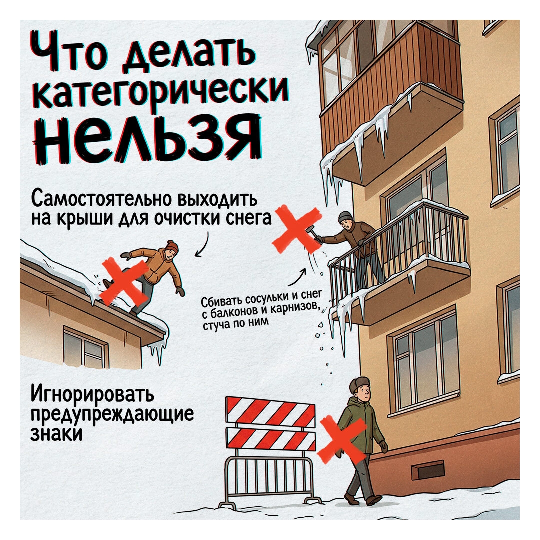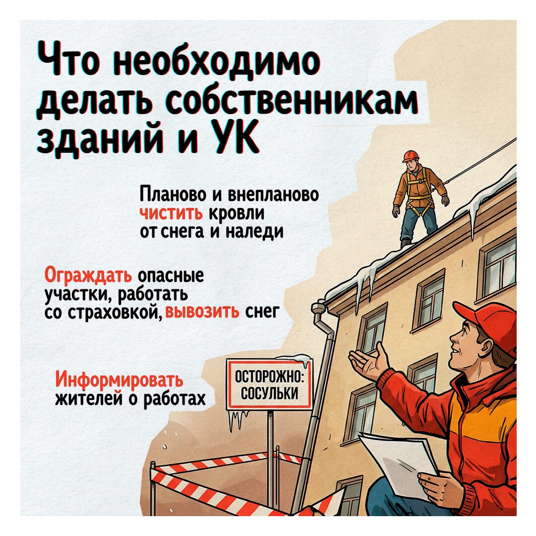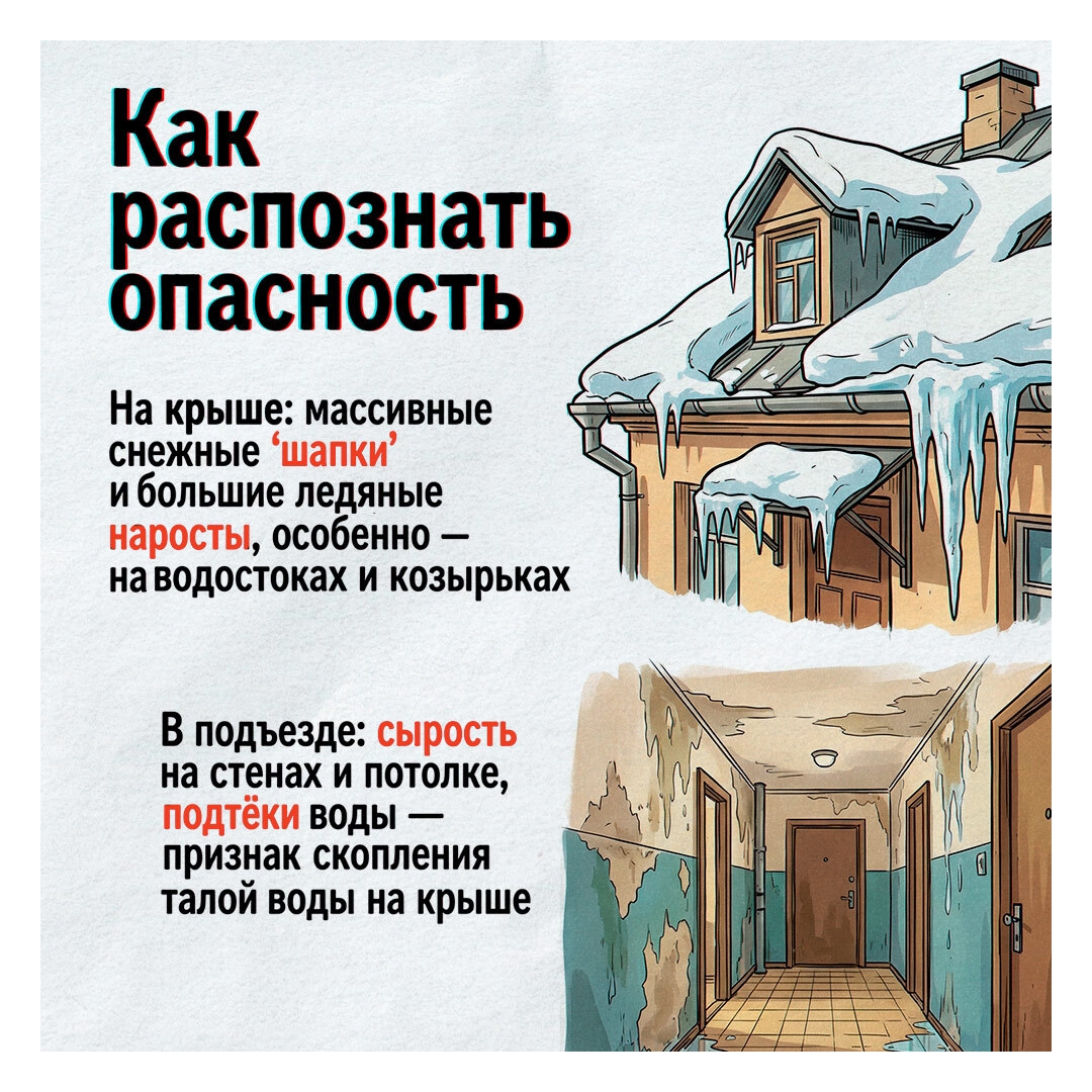 В карточках — кто отвечает за уборку снега и льда с крыш, куда обратиться, если ДУК бездействует и по какому номеру телефона можно сообщить об угрозе обрушения снежных масс.